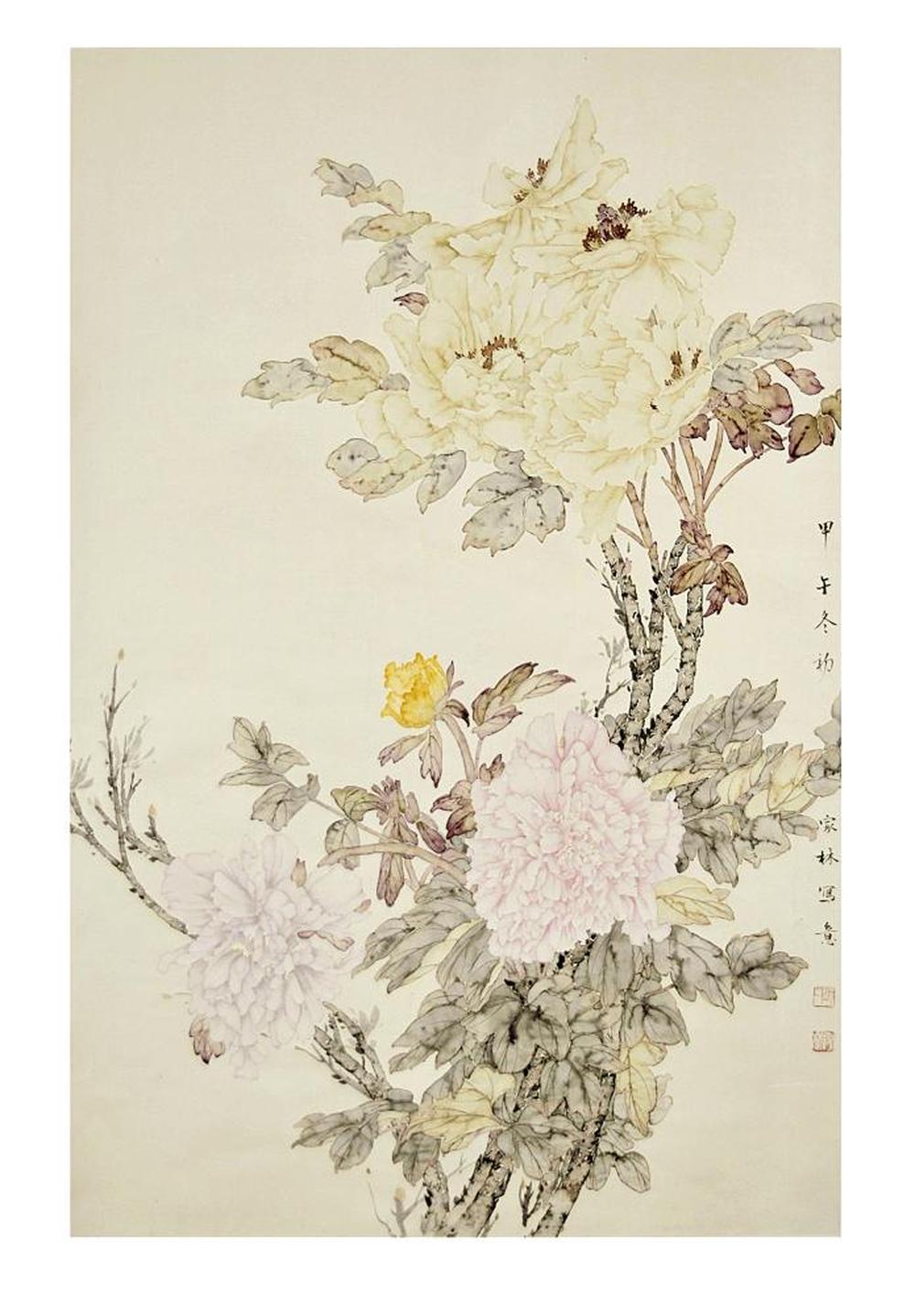 此画牡丹图。牡丹的描绘运用了恽寿平没骨画法,结合居廉创作的撞水、撞粉技法 以产生秀润亮丽、明暗参差的效果,整幅作品以兼工带写之法绘出,自然生动、写实准 确,画面有清新活波、文静抒情的意趣。